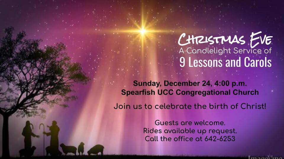 Looking for a special Christmas Eve service? You’ll find it at the Spearfish UCC Congregational Church! The service will have scripture readings and songs telling the Christmas story. Invite your friends and neighbors! Rides available for this special 4 p.m. service – call the office at 642-6253 to schedule a ride.