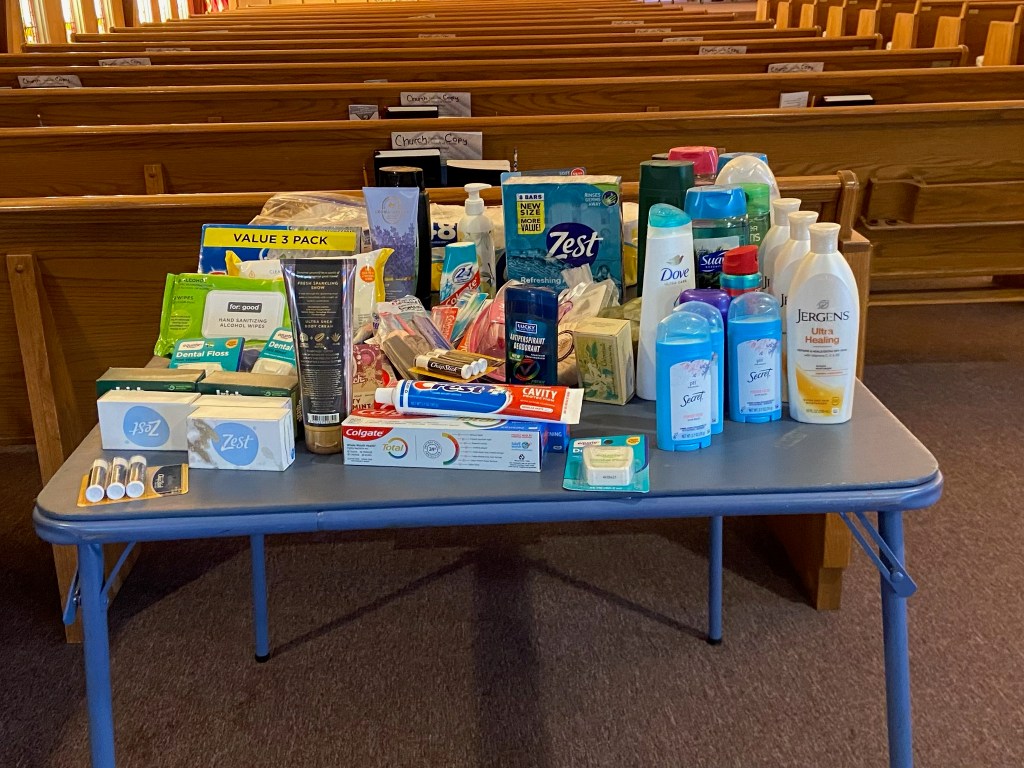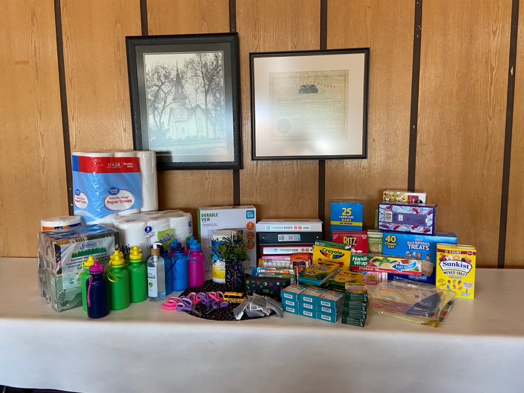 Pictured are all of the supplies collected by the congregation which were contributed to the local elementary schools for the 2025-2026 school year.
